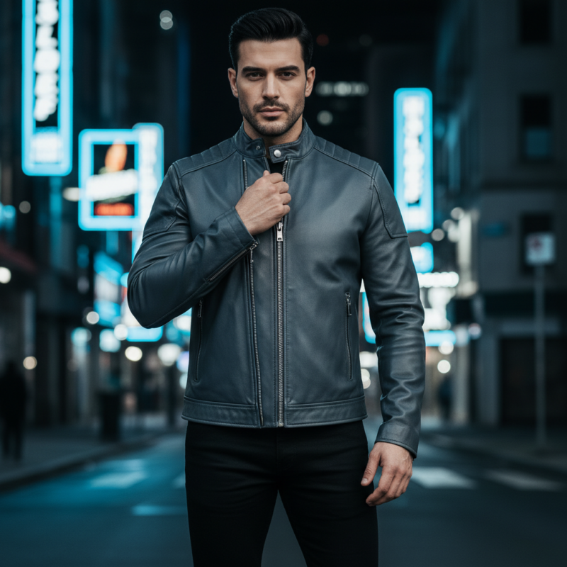 Men’s Steel Blue Leather Jacket – Contemporary Slim Fit Edition